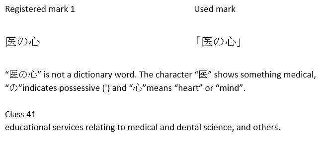 In any case, the court did not deny the inherent distinctiveness of “医の心” and “医心”, and we believe the fact that the contents of the defendant’s service corresponded to the above-indicated meaning strongly affected the judgment regarding non-trademark use. If the service had been for the purpose of improving the knowledge for passing the examination of medical department at colleges, the result may have changed. Hence, if the inherent distinctiveness of the subject registered mark had been disputed, there would have been possibility of the distinctiveness being admitted.